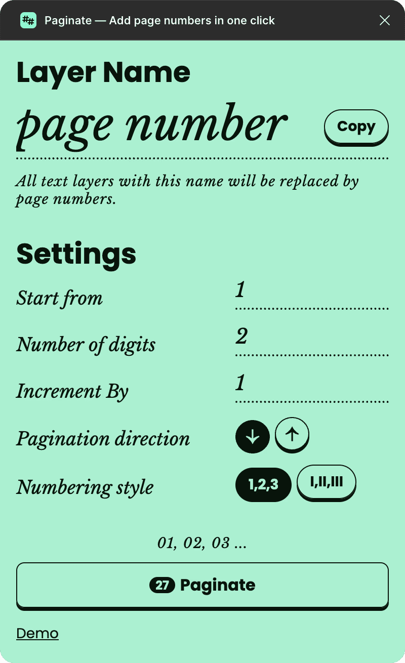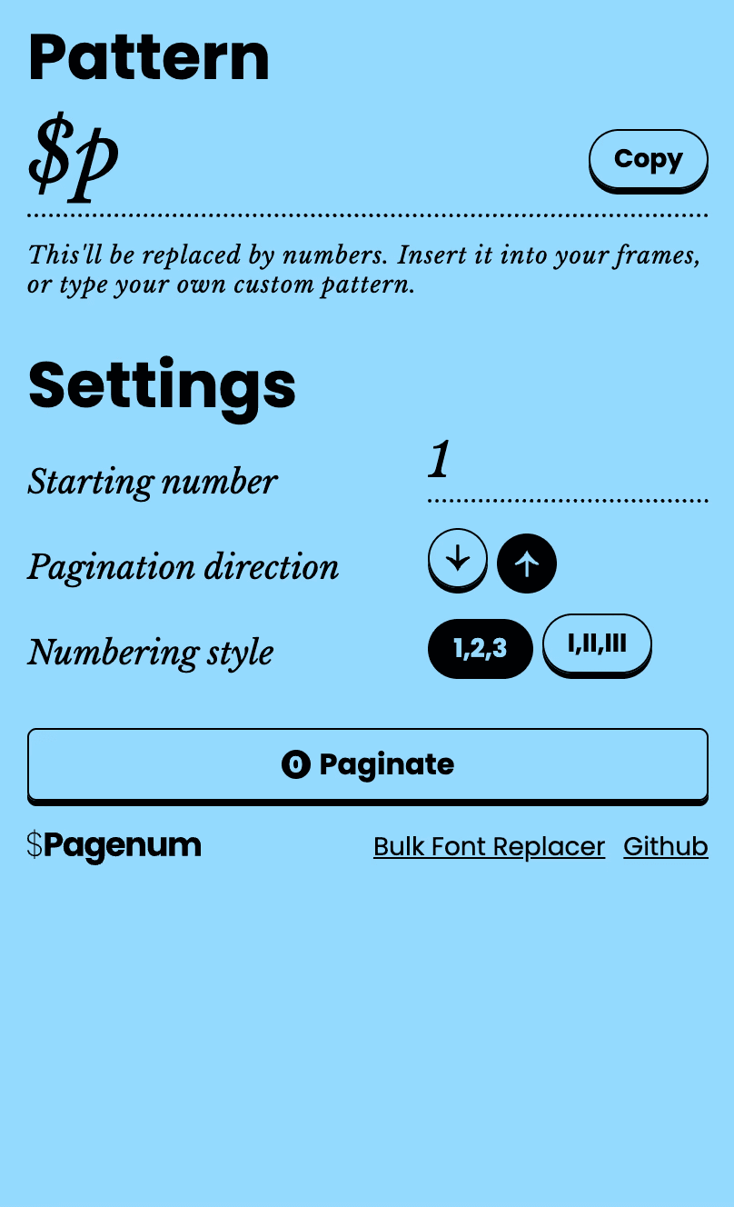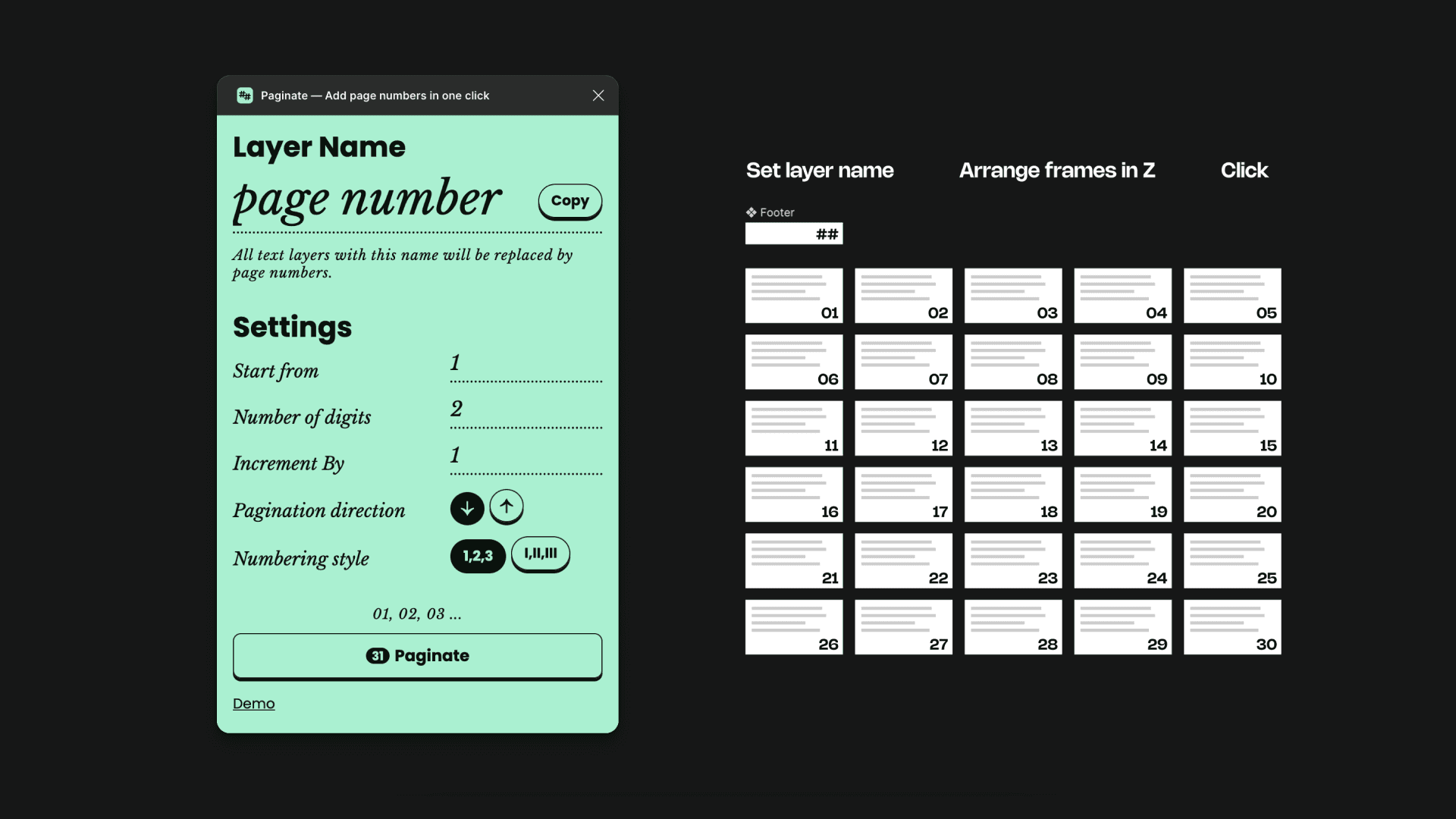 Paginate is a Figma plugin designed to make adding page numbers effortless. Built upon the open-source project Pagenum by Resul Çelik, Paginate enhances performance and introduces new customisation options to streamline your workflow.
