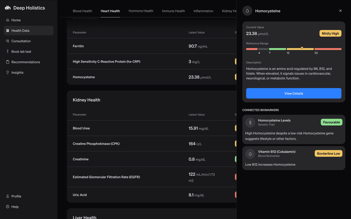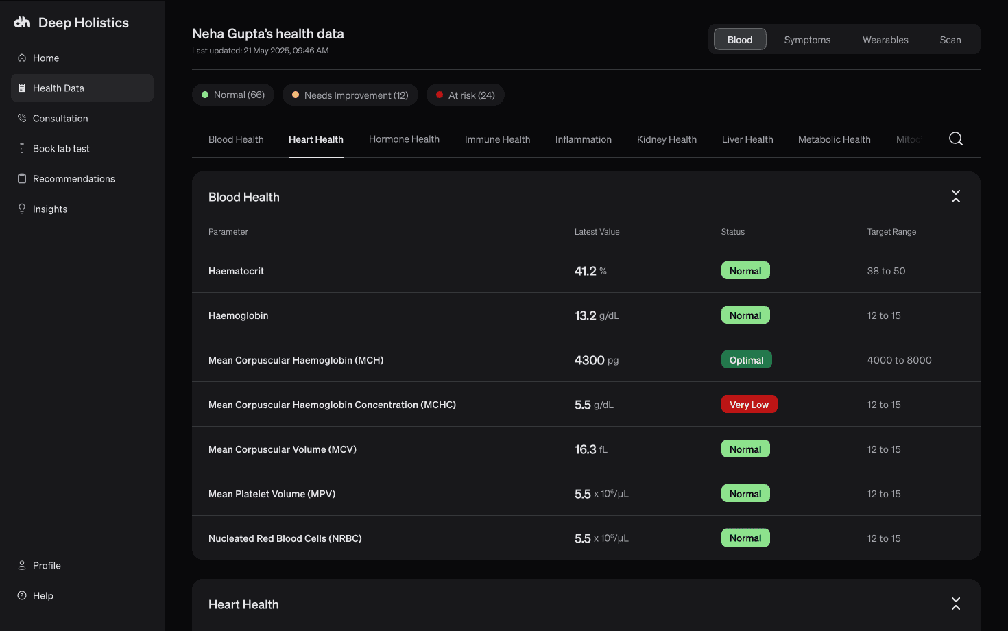 First thing we did was categorise all biomarkers into systems like Blood Health, Heart Health, Inflammation…